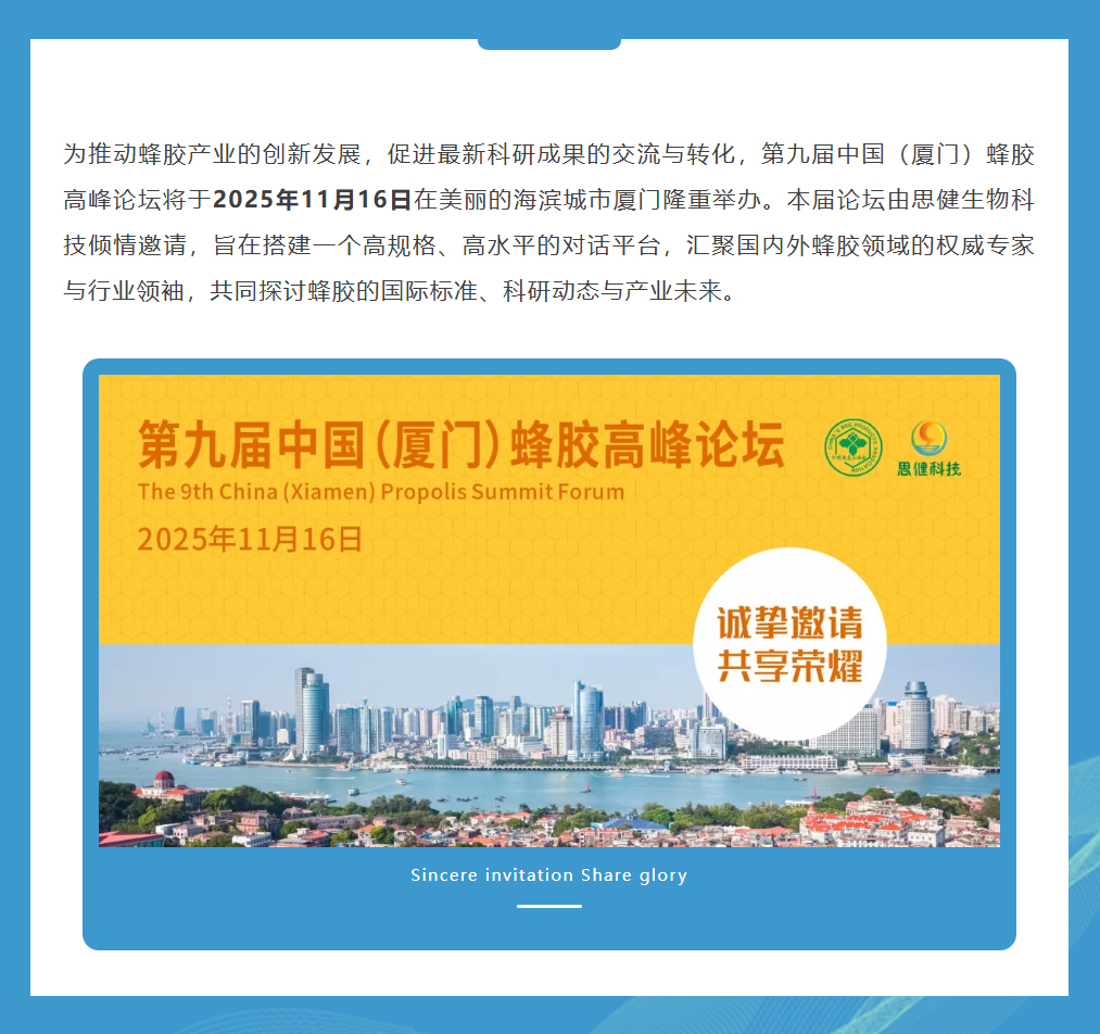 思健生物科技誠邀您共赴廈門(mén)出席第九屆中國(廈門(mén))蜂膠高峰論壇:與蜂業(yè)權威面對面,洞見(jiàn)蜂膠國際新未來(lái)